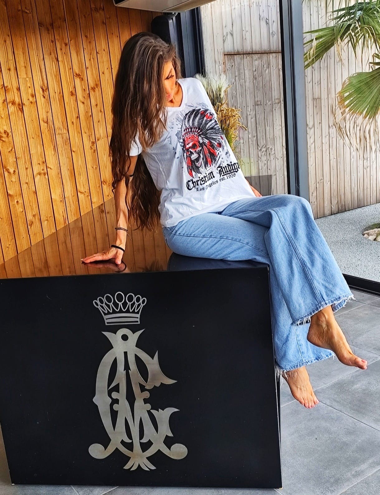 Affiche un style affirmé avec le T-shirt Apache White col V Christian Audigier. Son coloris blanc lumineux met en valeur le visuel emblématique « Magicien », signature forte de la marque, pour un look à la fois moderne et audacieux.